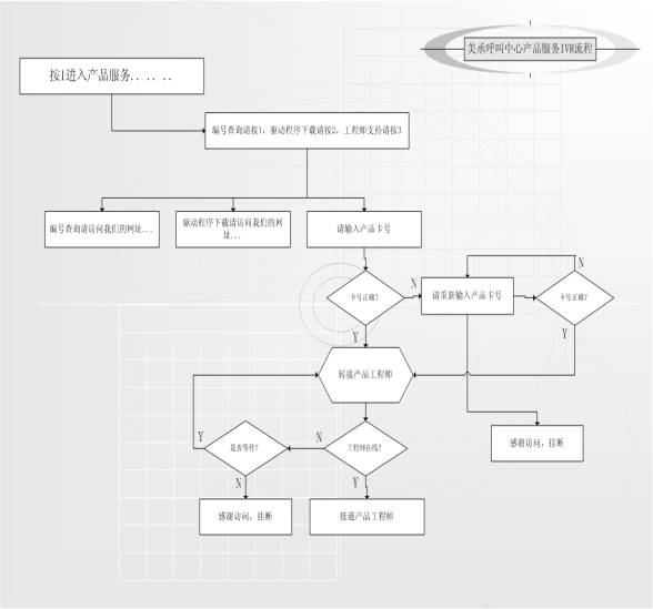 IVR系統(tǒng)是呼叫中心系統(tǒng)中極為重要的一環(huán)。作為面向用戶的窗口,IVR的語(yǔ)音交互方式引導(dǎo)用戶進(jìn)入不同的業(yè)務(wù)流程,聽(tīng)取相關(guān)信息。清晰,流暢,禮貌而又有層次的IVR語(yǔ)音會(huì)給用戶留下深刻的印象。美承的IVR系統(tǒng)在設(shè)計(jì)上參照了其他成功的客服中心的經(jīng)驗(yàn),充分考慮了用戶的習(xí)慣,在流程上具有鮮明的特點(diǎn),以下以產(chǎn)品服務(wù)為例: