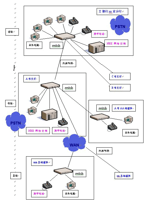 在銀行的省、市級分行分別部署一臺NBX網(wǎng)絡(luò)交換機(jī)——只需通過接入銀行系統(tǒng)內(nèi)部局域網(wǎng),經(jīng)過簡單的配置即可使用。然后根據(jù)需要,在市內(nèi)各個儲蓄所、各縣級儲蓄所配置相應(yīng)數(shù)量的數(shù)字話機(jī),那么在全省內(nèi)各個縣市區(qū)的各個營業(yè)網(wǎng)點之間,上下級之間就都可以使用數(shù)字電話機(jī)通過數(shù)據(jù)網(wǎng)免費撥打語音電話。