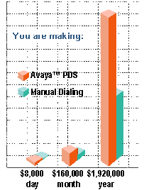 假定您的公司仍然銷售面值50美元的預(yù)付費(fèi)電話卡。您有10名業(yè)務(wù)代表,現(xiàn)在每小時(shí)分別可同16個(gè)潛在客戶交談。同我們的手工撥號(hào)場(chǎng)景相同,每8人中有一位同意購(gòu)卡。您現(xiàn)在每小時(shí)可銷售20張卡,每天為160張卡。