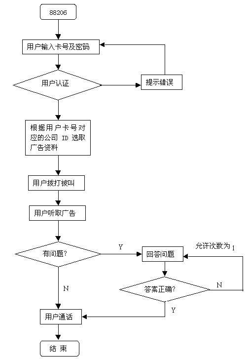4)可設置廣告廠家的客戶服務中心電話,如電話用戶需要,可將其與該電話連通,同時在卡上計費,費率按本地到該通達地區(qū)計算。