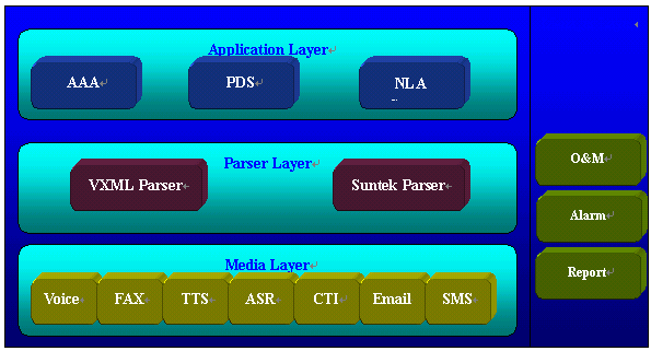 面向快速集成開發(fā),靈活開放、堅如磐石,可擴展性極強。它廣泛支持各類主流交換機和CTI中間件,提供了自動語音,傳真收發(fā),大規(guī)模會議,TTS/ASR,VXML,支持直接對外部數(shù)據(jù)操作和DLL調(diào)用等領(lǐng)先功能。Ssurnon-IVR已經(jīng)在國內(nèi)絕大多數(shù)語音增值運營商在線運行,例如,TOM.COM公司采用新太I(xiàn)VR系統(tǒng),憑借快速的新業(yè)務(wù)開發(fā)和強大的功能,業(yè)務(wù)發(fā)展非常迅速,三個月后語音增值營業(yè)收入達(dá)到每月數(shù)百萬元。