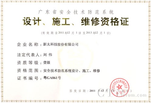 CTI論壇(ctiforum)12月21日消息(記者 張潔):2011年12月,新太科技再傳喜訊,公司順利通過廣東省公安廳認(rèn)定的“廣東省安全技術(shù)防范系統(tǒng)設(shè)計(jì)、施工、維修一級(jí)資格證”換證審核,成功獲得新證書。