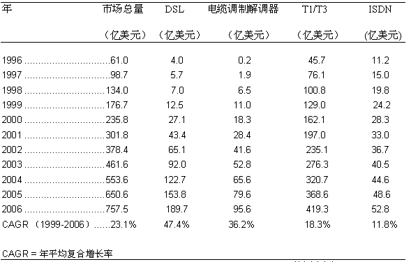 而ISDN接入服務(wù)的增長則較為緩慢,年平均復(fù)合增長率將僅為11.8%,市場規(guī)模約是52.3億美元,占整個寬帶接入市場的5.9%。