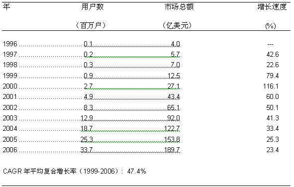 圖一: 美國寬帶接入服務(wù)市場的增長歷史和預(yù)測 1996-2006
