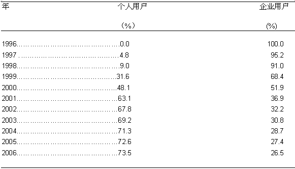 企業(yè)用戶,主要是中小企業(yè)用戶占DSL總用戶數(shù)的68.4%。而到了2000年,美國市場上48.1%的DSL用戶為家庭用戶,企業(yè)用戶的比例下降為51.9%。Frost