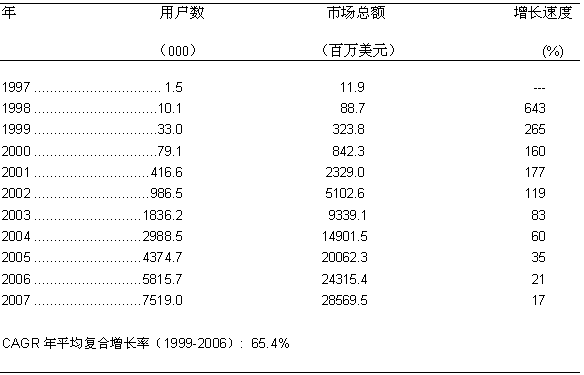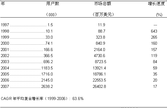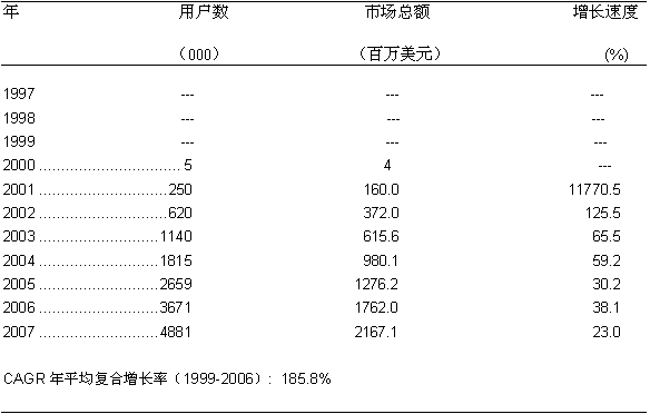 圖一: 美國(guó)寬帶無(wú)線固定接入市場(chǎng)的增長(zhǎng)歷史和預(yù)測(cè) 1997-2007