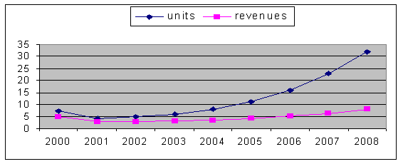 圖2、2000年至2008年全球視頻會議桌面系統(tǒng)市場:數(shù)量與收入預測