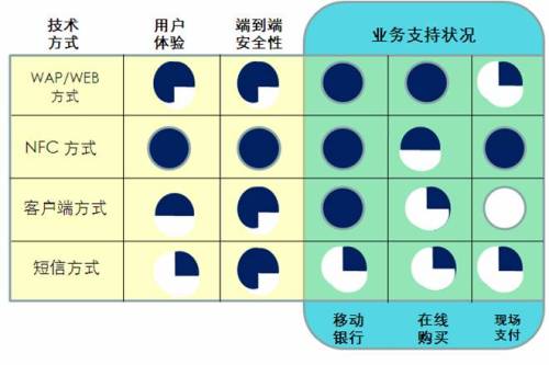 移動支付(Mobile payment)包括遠距離方式和近距離方式。遠距離移動支付的主要技術實現(xiàn)方式有SMS、WAP、客戶端(手機軟件)和USSD;近距離移動支付的主要技術實現(xiàn)方式有紅外和NFC。各種移動支付業(yè)務技術實現(xiàn)方式優(yōu)劣勢比較詳見圖表1。