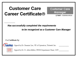 學(xué)員在經(jīng)過完整的課程培訓(xùn)之后,經(jīng)考試合格,可以獲得由美國俄亥俄州立大學(xué)與太維資訊有限公司聯(lián)合頒發(fā)的的專業(yè)培訓(xùn)證書。客戶服務(wù)中心認(rèn)證的目的有兩個:首先,對于已經(jīng)在客服中心從業(yè)的人員,太維公司的培訓(xùn)可以提供一個提升他們工作能力的機(jī)會,通過培訓(xùn)后不同層次的專業(yè)培訓(xùn)認(rèn)證,太維公司以行業(yè)的標(biāo)準(zhǔn)要求對他們的提升加以證明,以加強(qiáng)他們在行業(yè)中的競爭能力。其次,對于有志致力于在客戶服務(wù)行業(yè)從業(yè)的人事,太維公司廣泛深入、滿足各種需求的專門技術(shù)培訓(xùn)與相應(yīng)的不同層次的認(rèn)證,為他們進(jìn)入該行業(yè)提供一個標(biāo)準(zhǔn)的素質(zhì)證明,以使他們能夠順利勝任客戶服務(wù)中心的各種主要的工作職位。