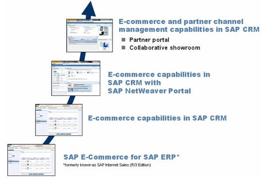 從上圖中,我們可以清楚地看出SAP的電子商務(wù)(E-Commerce)功能經(jīng)歷了一個(gè)不斷進(jìn)化的過程。主要分成以下四個(gè)階段: