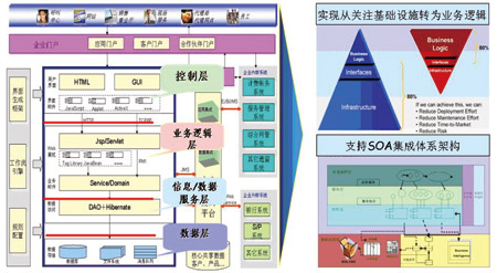 在具體實(shí)現(xiàn)的技術(shù)路線(xiàn)上,產(chǎn)品采用以J2EE為核心的層次化體系結(jié)構(gòu),基于業(yè)務(wù)流程管理和業(yè)務(wù)規(guī)則管理引擎,實(shí)現(xiàn)界面表現(xiàn)層與業(yè)務(wù)邏輯層、業(yè)務(wù)邏輯層與應(yīng)用組件層、應(yīng)用組件層與數(shù)據(jù)訪問(wèn)層、數(shù)據(jù)訪問(wèn)層與數(shù)據(jù)存儲(chǔ)層之間的分離,支持統(tǒng)一的權(quán)限管理和認(rèn)證機(jī)制以及統(tǒng)一的企業(yè)門(mén)戶(hù)接入。(如圖1所示)