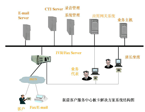 新晨客戶服務(wù)中心普及型解決方案是在以專用交換機(jī)或PC服務(wù)器加語音卡作為電話接入設(shè)備,如果用PC服務(wù)器加語音卡作為電話接入設(shè)備,將電話中繼線直接接到IVR上。此方案中的CTI系統(tǒng)能夠適用于流行的語音板卡和多種電話交換機(jī)的不同環(huán)境,這種解決方案主要針對(duì)小型的客戶服務(wù)中心推出。