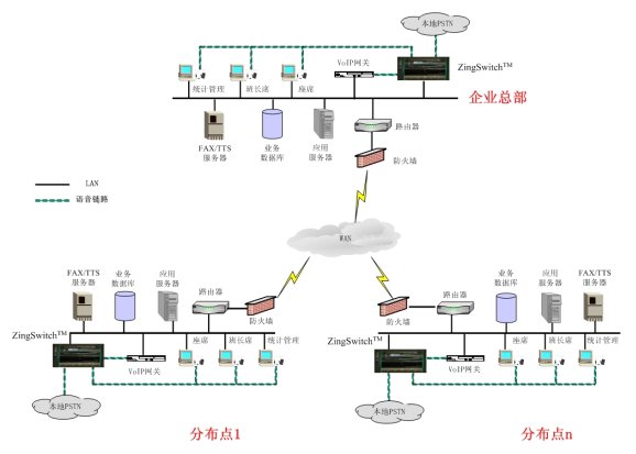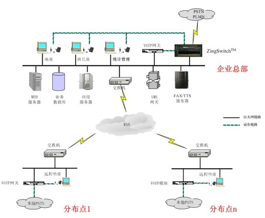 遠(yuǎn)程中繼和遠(yuǎn)程座席的方案非常適用于在一些接入或是座席需求數(shù)量非常小的地點(diǎn)部署VoIP座席網(wǎng)關(guān)和遠(yuǎn)程座席,使得客戶能夠通過一個(gè)全國(guó)統(tǒng)一的客服號(hào)碼或是當(dāng)?shù)氐碾娫捥?hào)碼就近接入到呼叫中心平臺(tái),并且通過互聯(lián)網(wǎng)進(jìn)行連接和語音傳輸;同時(shí),客戶與遠(yuǎn)程座席之間的交流與普通的集中座席員之間毫無區(qū)別,遠(yuǎn)程座席只相當(dāng)于ZingSwitch®一體化交換機(jī)的一個(gè)遠(yuǎn)程分機(jī)。