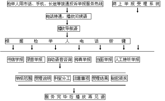 本系統(tǒng)充分借助計(jì)算機(jī)及通迅線路的優(yōu)勢(shì),將高度普及的電話線路,同高科技的計(jì)算機(jī)處理緊密結(jié)合起來,通過電話語音這一人類最易溝通交流的途徑和手段,將檢舉人和檢察院緊密結(jié)合起來。檢舉人通過簡(jiǎn)單的拔通服務(wù)電話,使用電話按鍵,利用自動(dòng)語音導(dǎo)航和人工服務(wù),實(shí)現(xiàn)以上熱線投訴舉報(bào)的自動(dòng)咨詢及人工服務(wù)的各項(xiàng)功能。
