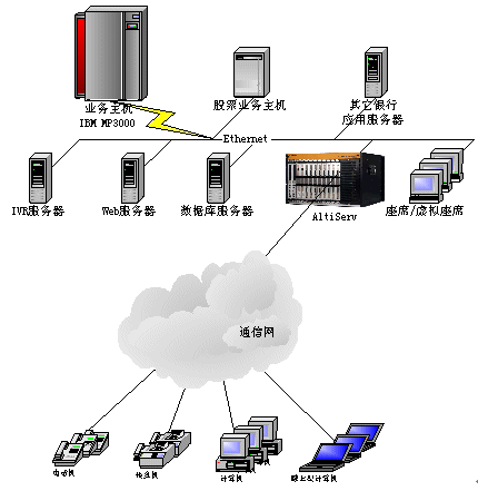 。。目標(biāo)是建立一個(gè)功能完善的客戶服務(wù)中心,涵蓋自動(dòng)語(yǔ)音應(yīng)答(IVR)、人工座席、WEB呼叫、客戶資料查詢統(tǒng)計(jì)以及與現(xiàn)有的銀行其他業(yè)務(wù)系統(tǒng)的結(jié)合。整個(gè)系統(tǒng)采用奧迪堅(jiān)呼叫中心系統(tǒng)AltiCenter,系統(tǒng)以一個(gè)特定號(hào)碼xxxxx作為呼叫中心的系統(tǒng)號(hào)碼(也可提供多個(gè)電話號(hào)碼),集中受理客戶的業(yè)務(wù)需求,為客戶提供綜合性服務(wù)。它能與Internet、資料庫(kù)系統(tǒng)很好地集成,實(shí)現(xiàn)資料共用和各種其他不同的業(yè)務(wù)功能。