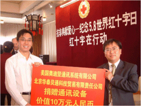 4月,SARS在北京肆無忌彈的橫行,其它國家和地區(qū)也都不同程度地受到SARS的侵害,給人民的生活和工作帶來了極大的影響,人們的身體健康和生命安全受到了威脅。中國紅十字會廣大工作人員對此次疫情迅速響應(yīng),為了支持中國中國紅十字會總開展SARS疫情的救助和捐贈工作,幫助其通過現(xiàn)代化的通訊手段快速準確的進行話務(wù)處理,以便更好地保護人民的生命和健康,4月30日,奧迪堅通訊系統(tǒng)(上海)有限公司聯(lián)合北京華泰貝通科技貿(mào)易有限責任公司向中國紅十字會總會捐贈了價值約10萬余人民幣的呼叫中心系統(tǒng),軟件以及相關(guān)服務(wù),以實際行動幫助中國紅十字會總會抗擊SARS。