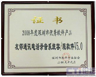 2009年1月,友鄰通訊電話錄音系統(tǒng)客/服軟件V5.0 榮獲由深圳市軟件行業(yè)協(xié)會頒發(fā)的“2008年度深圳市優(yōu)秀軟件產(chǎn)品”榮譽證書。“2008年度深圳市優(yōu)秀軟件產(chǎn)品”的評選是深圳市軟件行業(yè)協(xié)會在全市范圍內(nèi)舉辦的軟件產(chǎn)品推優(yōu)活動,經(jīng)過了企業(yè)申報、技術資料審核、專家評審等等幾大嚴格篩選程序。