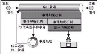 在路由管道中流轉(zhuǎn)著加載了業(yè)務(wù)的工作流事件。事件按照事先定義的路由規(guī)則流轉(zhuǎn),事件的路由規(guī)則定義了事件在路由管道中可以?康摹罢九_”,同時定義了事件到達(dá)“站臺”時可以領(lǐng)取并處理加載在事件上的業(yè)務(wù)的角色。事件從始發(fā)站臺進(jìn)入路由管道,經(jīng)過一個或多個中間站臺,最后到達(dá)終點站。事件每停靠一個站臺,相關(guān)人員領(lǐng)取事務(wù),并進(jìn)行處理后重新裝載事務(wù),觸發(fā)事件向下一個站臺流轉(zhuǎn),除非事件已經(jīng)到達(dá)終點站。