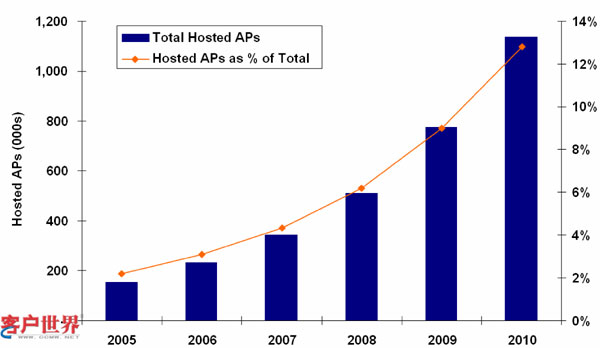 根據(jù)datamonitor在2006年的分析,自2005年起,全球呼叫中心托管的總數(shù)約二十萬(wàn)個(gè)座席,占全球呼叫中心的總座席數(shù)得2%,到2008年成長(zhǎng)到約五十萬(wàn)個(gè)座席,占總量的6%左右,在2010年時(shí)更會(huì)成長(zhǎng)到超過(guò)一百萬(wàn)個(gè)座席占總數(shù)的10%左右。所以整個(gè)托管市場(chǎng)來(lái)說(shuō)將會(huì)持續(xù)不斷的成長(zhǎng)(見(jiàn)圖二)。
