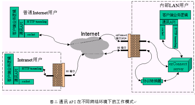 普通Internet用戶(例如撥號上網(wǎng)或小區(qū)ADSL)對Internet資源的訪問一般不受限制,所以只需解決如何穿越保衛(wèi)著ezConnect服務器的防火墻的問題。訊泰公司的方案是開發(fā)一套通用的通訊API,