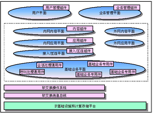 從結(jié)構(gòu)上看,業(yè)務(wù)驅(qū)動的軟交換平臺是一個(gè)復(fù)雜的多域多層組件平臺。一個(gè)電信業(yè)務(wù)的實(shí)現(xiàn)是對平臺上的組件的組裝過程。業(yè)務(wù)驅(qū)動的軟交換平臺上的組件分為用戶平面、基礎(chǔ)業(yè)務(wù)平面、接入/互連/移動控制平面、應(yīng)用平面、內(nèi)容平面和業(yè)務(wù)管理平面。用戶平面的組件負(fù)責(zé)維護(hù)用戶的注冊信息、位置信息、狀態(tài)信息、業(yè)務(wù)信息和業(yè)務(wù)使用信息。基礎(chǔ)業(yè)務(wù)平面的組件分為三大類型:電路基礎(chǔ)業(yè)務(wù)、包交換基礎(chǔ)業(yè)務(wù)和多媒體交換基礎(chǔ)業(yè)務(wù)。每個(gè)基礎(chǔ)業(yè)務(wù)分成傳輸層、承載層、媒體層、呼叫處理層和業(yè)務(wù)層,其中的控制包括了對各層功能的控制協(xié)議和層間交互的控制協(xié)議。接入/互連/移動控制平面中包含了對各種接入網(wǎng)絡(luò)的控制、對互聯(lián)網(wǎng)絡(luò)的控制和對移動性的控制協(xié)議,也分成傳輸層、承載層、媒體層、呼叫處理層和業(yè)務(wù)層的控制組件。應(yīng)用平面的組件分為三種類型,基于傳統(tǒng)智能網(wǎng)(IN,