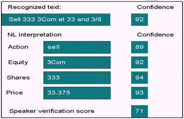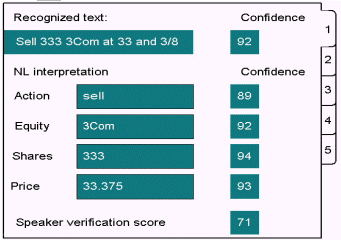 也可使用外部的應(yīng)用知識內(nèi)容來確定多結(jié)果中的哪一個(gè)是有效的。例如,經(jīng)紀(jì)業(yè)務(wù)應(yīng)用程序,它的用戶投資隨時(shí)間變化而變化。系統(tǒng)可使用簡單的語法來識別股票證券的名稱。識別時(shí),系統(tǒng)產(chǎn)生一個(gè)最佳前N個(gè)股票名稱的清單,標(biāo)明假設(shè)的股票證券名稱。應(yīng)用程序然后將每個(gè)清單項(xiàng)目(由最佳到最差)和現(xiàn)有股票證券名稱進(jìn)行比較,從而為該用戶找到可能性最大的一個(gè)。下圖展示的是這些多結(jié)果情況,每個(gè)結(jié)果都可能有它自身的已被識別的文本、NL解釋和置信度分值。在這一例中,請求了五個(gè)識別結(jié)果。