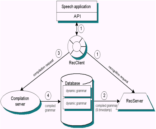 在特定配置下,呼叫控制和提示回放由Nuance系統(tǒng)外的組件控制,RecClient也可用于偷聽模式。最后,RecClient將音頻傳給識別服務(wù)器(RecServer),并將事件和結(jié)果回傳給應(yīng)用程序。