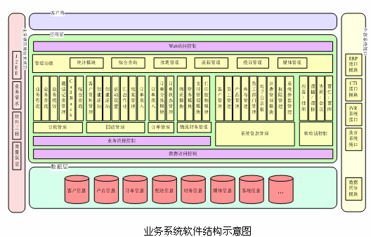 電視購(gòu)物呼叫中心系統(tǒng)包括客戶管理模塊、會(huì)員管理模塊、通話記錄、CALL-BACK單、訂單管理、訂單分檢、物流模塊、財(cái)務(wù)模塊、計(jì)費(fèi)管理模塊、媒體模塊、投訴模塊、FAQ模塊、產(chǎn)品管理模塊、庫(kù)存管理模塊、綜合查詢模塊、排班管理、在線培訓(xùn)、電子公告板、事件跟蹤管理模塊、統(tǒng)計(jì)模塊、權(quán)限管理模塊和參數(shù)管理模塊。