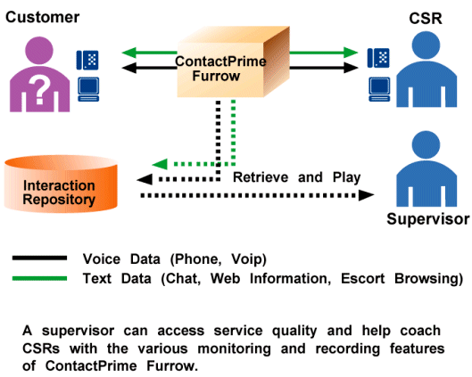 ContactPrime Furrow提供一套簡(jiǎn)單易用的度量工具以幫助呼叫中心管理員公正準(zhǔn)確的評(píng)估CSR的業(yè)績(jī)。管理員可以監(jiān)視CSR與客戶現(xiàn)場(chǎng)的交互過(guò)程(語(yǔ)音與數(shù)據(jù)),或者瀏覽記錄的事件,以有效的評(píng)估服務(wù)質(zhì)量。