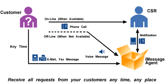 iMessage Agent使您的機(jī)構(gòu)可以任何時(shí)間、任何地點(diǎn)接收到來(lái)自客戶(hù)的所有請(qǐng)求。當(dāng)CSR到位的時(shí)候,呼叫請(qǐng)求會(huì)被自動(dòng)的直接送交給指定的CSR處。當(dāng)CSR不在時(shí),iMessage