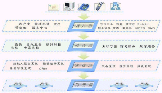 證券客戶服務系統(tǒng)面向用戶提供電話、傳真、網絡等方式的咨詢、查詢、委托、銀行轉帳、自動業(yè)務等業(yè)務功能。系統(tǒng)以提供“個性化、社會化、信息化”服務為重要特征,具有“滿足未來業(yè)務發(fā)展需要”、“滿足實時處理”的能力。系統(tǒng)在設計、實現(xiàn)上,以具有先進技術和高穩(wěn)定性的呼叫中心平臺為基礎,竭力為證券業(yè)務運營商建立一個強大、開放、靈活的業(yè)務服務系統(tǒng),更好地滿足證券用戶日益增長的各種新的服務需求,保持證券企業(yè)在市場競爭中的優(yōu)勢。