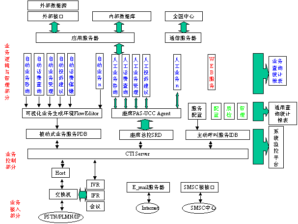 平臺(tái)部分完成系統(tǒng)的基本服務(wù)處理,不針對(duì)具體的服務(wù)業(yè)務(wù),提供電話(huà)接入、呼叫控制、人工/自動(dòng)服務(wù)、e_mail服務(wù)、WEB服務(wù)、SMSC服務(wù)等的基礎(chǔ)環(huán)境。業(yè)務(wù)部分完成系統(tǒng)的業(yè)務(wù)描述,按照平臺(tái)的業(yè)務(wù)接口,針對(duì)聯(lián)通1001客戶(hù)服務(wù)的每一個(gè)具體業(yè)務(wù)需要,開(kāi)發(fā)相應(yīng)的服務(wù)業(yè)務(wù)功能模塊或流程,實(shí)現(xiàn)系統(tǒng)的服務(wù)業(yè)務(wù)。業(yè)務(wù)部分完全建立在PAS-UCC平臺(tái)之上。