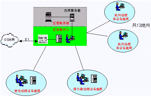 采用在區(qū)中心建設(shè)集中客戶(hù)服務(wù)系統(tǒng),在部分地州設(shè)置遠(yuǎn)程話(huà)務(wù)服務(wù)中心的方式進(jìn)行建設(shè)。在沒(méi)有配備遠(yuǎn)程話(huà)務(wù)座席的地州,則將用戶(hù)的服務(wù)交給就近的話(huà)務(wù)中心來(lái)完成,只設(shè)置非話(huà)務(wù)遠(yuǎn)程座席,處理屬于該地州的業(yè)務(wù),如投訴等信息、查詢(xún)統(tǒng)計(jì)報(bào)表、用戶(hù)回訪(fǎng)等。