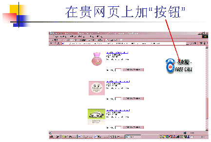 簡(jiǎn)單地說(shuō),就是當(dāng)有客戶瀏覽到網(wǎng)上購(gòu)物的網(wǎng)頁(yè)時(shí),若有任何疑問(wèn)或想立即購(gòu)買,只要點(diǎn)擊在網(wǎng)頁(yè)上的“按鈕”鍵,就可以直接接通到網(wǎng)站的客服中心,實(shí)現(xiàn)即時(shí)地語(yǔ)音互動(dòng)。也不需再像以前那樣發(fā)E-MAIL或撥電話號(hào)碼了。效果可謂是立竿見(jiàn)影。(如圖示)