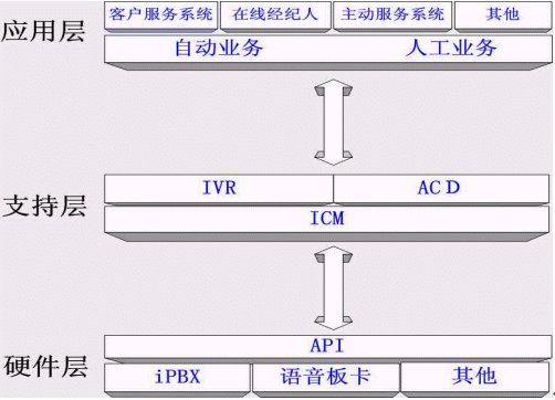 支持層由ICM(Intelligent Call Management 智能呼叫管理)、IVR(Interactive Voice Response