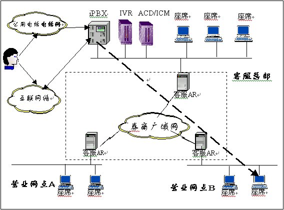 在總部設(shè)立集中的客戶服務(wù)中心完成對(duì)全網(wǎng)的人工座席的管理和調(diào)度,由總部的ACD完成對(duì)全網(wǎng)人工業(yè)務(wù)的呼叫分配,借助廣域網(wǎng)絡(luò),實(shí)現(xiàn)話務(wù)在區(qū)域范圍內(nèi)的接續(xù)。在座席配置上既可以采用集中配置,各營業(yè)部分散配置專家座席的方式。