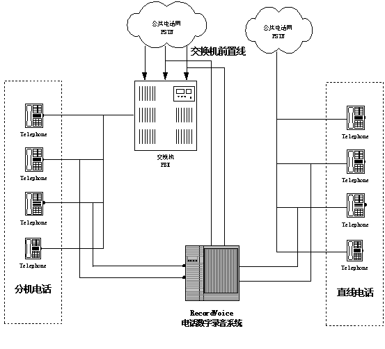 語音卡的模擬線接口和排隊(duì)機(jī)/交換機(jī)的模擬中繼并聯(lián),錄音工作站主要針對(duì)外線話音進(jìn)行錄音。