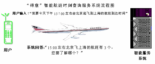使用"得意"智能航班時刻查詢服務系統(tǒng),用戶可以通過短信/WAP/互聯(lián)網(wǎng)以自然語言的方式與服務系統(tǒng)進行互動,方便地查詢各個航班的時刻,以及相關(guān)的信息。當用戶在對話過程中遇到困難時,系統(tǒng)還會主動引導用戶獲取想要的信息,能為乘客和交通機構(gòu)提供很好的服務手段,實現(xiàn)真正的"智能"。