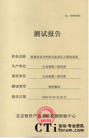CTI論壇(ctiforum)06月25日消息: 2009年3月02-10日:北京軟件產(chǎn)品質(zhì)量檢測檢驗中心對《海量語音文件的目標(biāo)說話人篩選系統(tǒng)》進(jìn)行了全面測試包括用戶文檔、功能性、可靠性、易用性、可維護(hù)性等多個特性。測試結(jié)果表明《海量語音文件的目標(biāo)說話 2009年3月02-10日,北京軟件產(chǎn)品質(zhì)量檢測檢驗中心對《海量語音文件的目標(biāo)說話人篩選系統(tǒng)》進(jìn)行了全面人篩選系統(tǒng)》滿足軟件相關(guān)國家標(biāo)準(zhǔn)中的要求,系統(tǒng)在模擬測試環(huán)境中運行正常、穩(wěn)定,正式通過北京軟件產(chǎn)品質(zhì)量檢測檢驗中心的嚴(yán)格測試,系統(tǒng)的漏識率和誤警率分別達(dá)到了2.81%和 2.81%。
