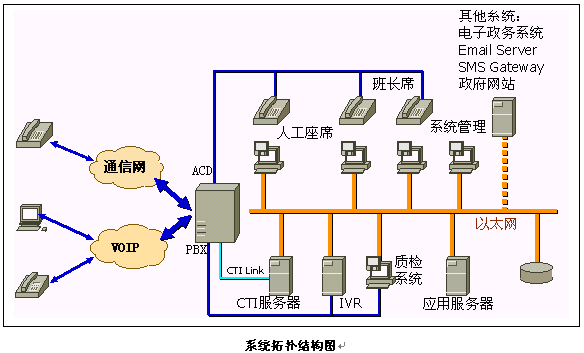 《政府呼叫中心系統(tǒng)》采用聲軟科技的《XCCP呼叫中心系統(tǒng)》平臺,主要由PBX交換機(jī)、CTI服務(wù)器、IVR系統(tǒng)、應(yīng)用服務(wù)器、數(shù)據(jù)庫服務(wù)器、TTS系統(tǒng)和座席系統(tǒng)等硬件設(shè)備和系統(tǒng)應(yīng)用軟件組成。它以電話服務(wù)為主要服務(wù)方式、結(jié)合計算機(jī)信息系統(tǒng)的資料數(shù)據(jù),為用戶提供全方位的服務(wù)。
