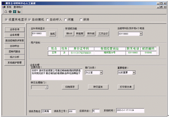 本系統(tǒng)具有自動(dòng)外撥功能,如通報(bào)最近暢銷卷煙的限額情況,通報(bào)最近增加的卷煙新品種與價(jià)格,通報(bào)煙草公司召集的活動(dòng)通知,卷煙經(jīng)營規(guī)范制度宣傳,電話訪銷,投訴和舉報(bào)違法經(jīng)銷行為的處理結(jié)果反饋等,從而煙草公司可跨越時(shí)間、空間,全方位的為客戶提供多樣化、個(gè)性化的服務(wù),并能夠及時(shí)的掌握客戶的各種要求。