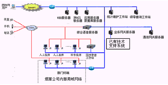 該系統(tǒng)的設(shè)計(jì)采用先進(jìn)的三層CLIENT/SERVER網(wǎng)絡(luò)體系結(jié)構(gòu),集目前先進(jìn)的計(jì)算機(jī)技術(shù)、通信技術(shù)、計(jì)算機(jī)電信集成(CTI)技術(shù)、多媒體呼叫接入技術(shù)、智能接入交換分配技術(shù)、數(shù)字語音處理技術(shù)、異構(gòu)系統(tǒng)信息交互技術(shù)、INTERNET網(wǎng)絡(luò)技術(shù)、安全容錯(cuò)技術(shù)、網(wǎng)絡(luò)組網(wǎng)技術(shù)等于一體,并與煙草公司已有技術(shù)支持系統(tǒng)(如MIS系統(tǒng)、辦公自動(dòng)化系統(tǒng)等)緊密結(jié)合在一起,突破時(shí)空的限制,通過人工座席、自動(dòng)語音/傳真、煙草公司相關(guān)工作人員等為客戶提供電話、傳真、電子郵件、因特網(wǎng)、手機(jī)、短消息等多種服務(wù)形式的周到、快捷、全方位的服務(wù),為卷煙經(jīng)銷戶等客戶與煙草公司之間架起一座密切聯(lián)系的橋梁,使得客戶隨時(shí)隨地可以利用身邊的各種通訊工具獲得煙草公司的方便快捷的24小時(shí)全天候服務(wù)。