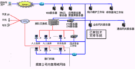 該煙草公司呼叫中心主要是由帶語音板卡的工控機(jī)或排隊(duì)交換機(jī)、CTI服務(wù)器、IVR(交互式語音應(yīng)答)/IFR(交互式傳真應(yīng)答)子系統(tǒng)、人工座席子系統(tǒng)、應(yīng)用服務(wù)器、數(shù)據(jù)庫服務(wù)器、業(yè)務(wù)網(wǎng)關(guān)子系統(tǒng)、通信網(wǎng)關(guān)子系統(tǒng)等硬件設(shè)備和應(yīng)用軟件組成。
