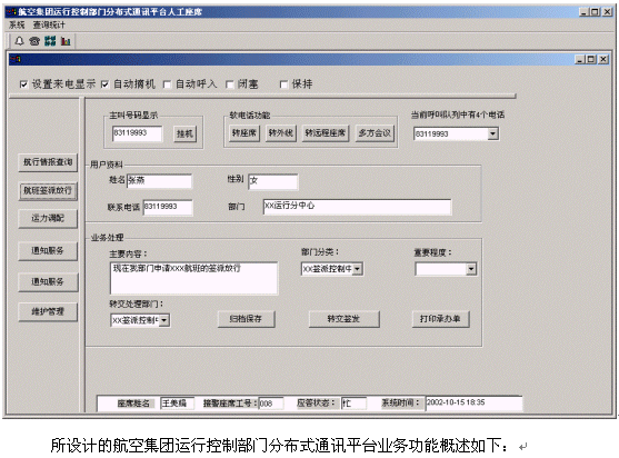 本系統(tǒng)具有主動外呼功能,如:及時通知運行保障指令,通知機組的實時控制和調(diào)整,通知各項航行情報等,從而航空集團運行控制部門可跨越時間、空間,全方位的為本地或異地有關(guān)部門/工作人員提供多樣化、個性化的飛行調(diào)度服務(wù)。