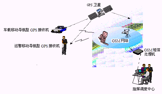 巡警移動終端將GPS衛(wèi)星接收天線收到的信號換算出的經(jīng)、緯度信息通過移動終端的內(nèi)置手機(jī)以短信息的方式(當(dāng)短信阻塞、不暢時則借助語音信道)發(fā)回公安機(jī)關(guān)指揮調(diào)度中心,公安機(jī)關(guān)指揮調(diào)度中心即可將其所在位置顯示于電子地圖上相應(yīng)的地理位置。