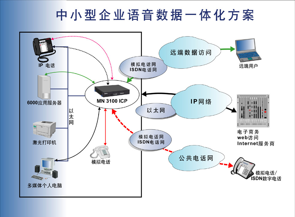商務電話系統(tǒng)、本地網(wǎng)和網(wǎng)關集成在統(tǒng)一的平臺上?敏迪網(wǎng)絡推出的MN3100綜合通信平臺就是這樣簡單快捷的滿足您的需要,它是專為小型企業(yè)或大型企業(yè)的分支機構(gòu)而設計的語音數(shù)據(jù)集成的解決方案。