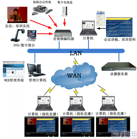 如上圖所示,會易錄采用前后臺分離模式,前臺設備(視音頻編碼器、數(shù)據(jù)編碼器)負責信號采集;后臺設備(多媒體錄播服務器)負責信號處理。前后臺設備之間通過IP網絡進行通訊。上述編碼器可將采集到的視音頻信號和計算機屏幕信號編碼后通過網絡發(fā)送到后臺的多媒體錄播服務器,多媒體錄播服務器可將收到的視音頻信號和計算機屏幕信號進行同步一體化的錄制、直播、點播。