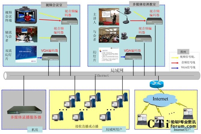 銳取多媒體錄播系統(tǒng)采用了分布式的架構(gòu),前端的視音頻編碼器負(fù)責(zé)視音頻信號(hào)的采集,后臺(tái)的多媒體錄播服務(wù)器負(fù)責(zé)信號(hào)的錄制、直播和點(diǎn)播。多媒體錄播系統(tǒng)可從視頻會(huì)議終端上獲取信號(hào),并將視頻會(huì)議實(shí)時(shí)直播到?jīng)]有視頻會(huì)議終端覆蓋的分行,擴(kuò)大了視頻會(huì)議的參與范圍,讓更多的員工可以參加遠(yuǎn)程培訓(xùn)。