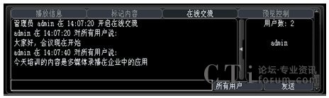 系統(tǒng)增加了多方文字互動(dòng)交流功能,在線交流功能可以選擇給所有人員發(fā)送消息,也可以選擇給某一特定人員發(fā)送。這樣在會(huì)議或培訓(xùn)的過(guò)程中,管理員可以選擇性的提出相應(yīng)的問(wèn)題給相關(guān)人員,考核相關(guān)人員的培訓(xùn)效果;其他人員也可以將會(huì)議或培訓(xùn)過(guò)程中遇到的疑問(wèn)、難點(diǎn)及時(shí)的反應(yīng)給管理員進(jìn)行解答,增強(qiáng)會(huì)議或培訓(xùn)的成效。