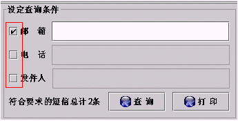 ·也可以通過給定查詢條件來查詢某項(xiàng)內(nèi)容,如針對某個郵箱、手機(jī)電話或發(fā)件人,方法是通過點(diǎn)擊左邊的小方框來選中,然后輸入相應(yīng)內(nèi)容即可,如下圖: